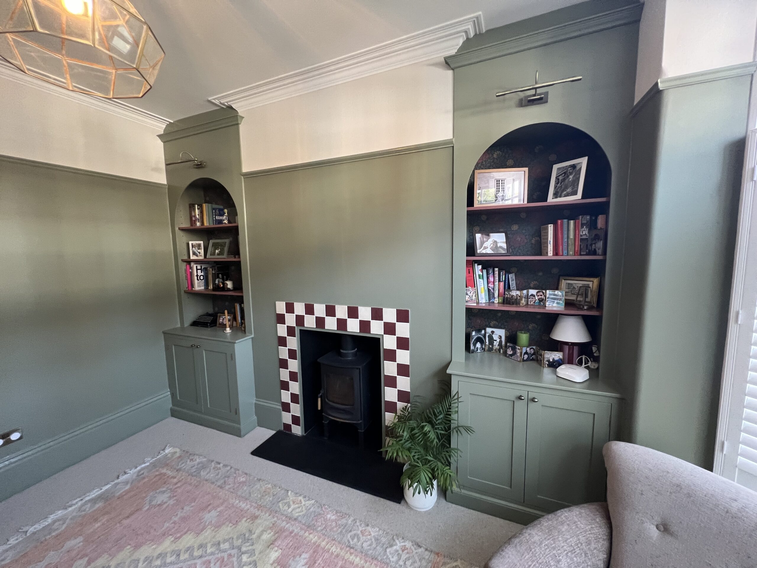 In the living room, we used Little Greene “Sage Green” to create a calming and timeless feel, complemented by contrasting tones on the built-in shelving and wallpaper detail behind for added depth and character.