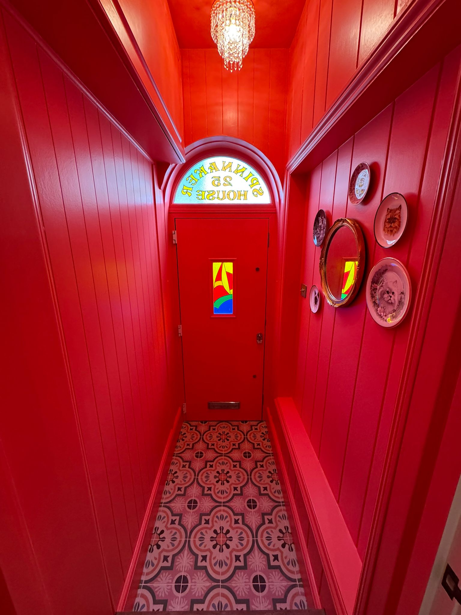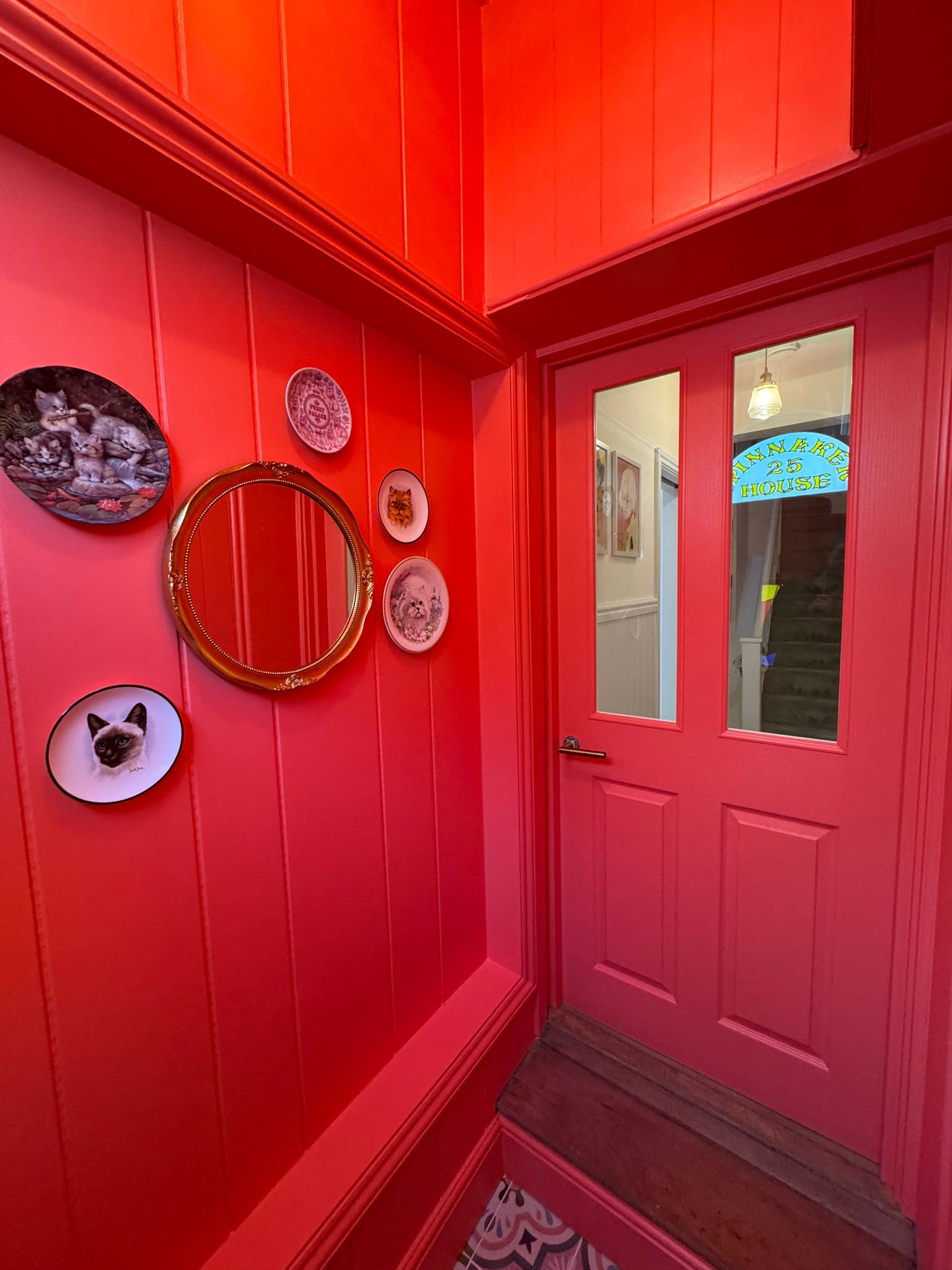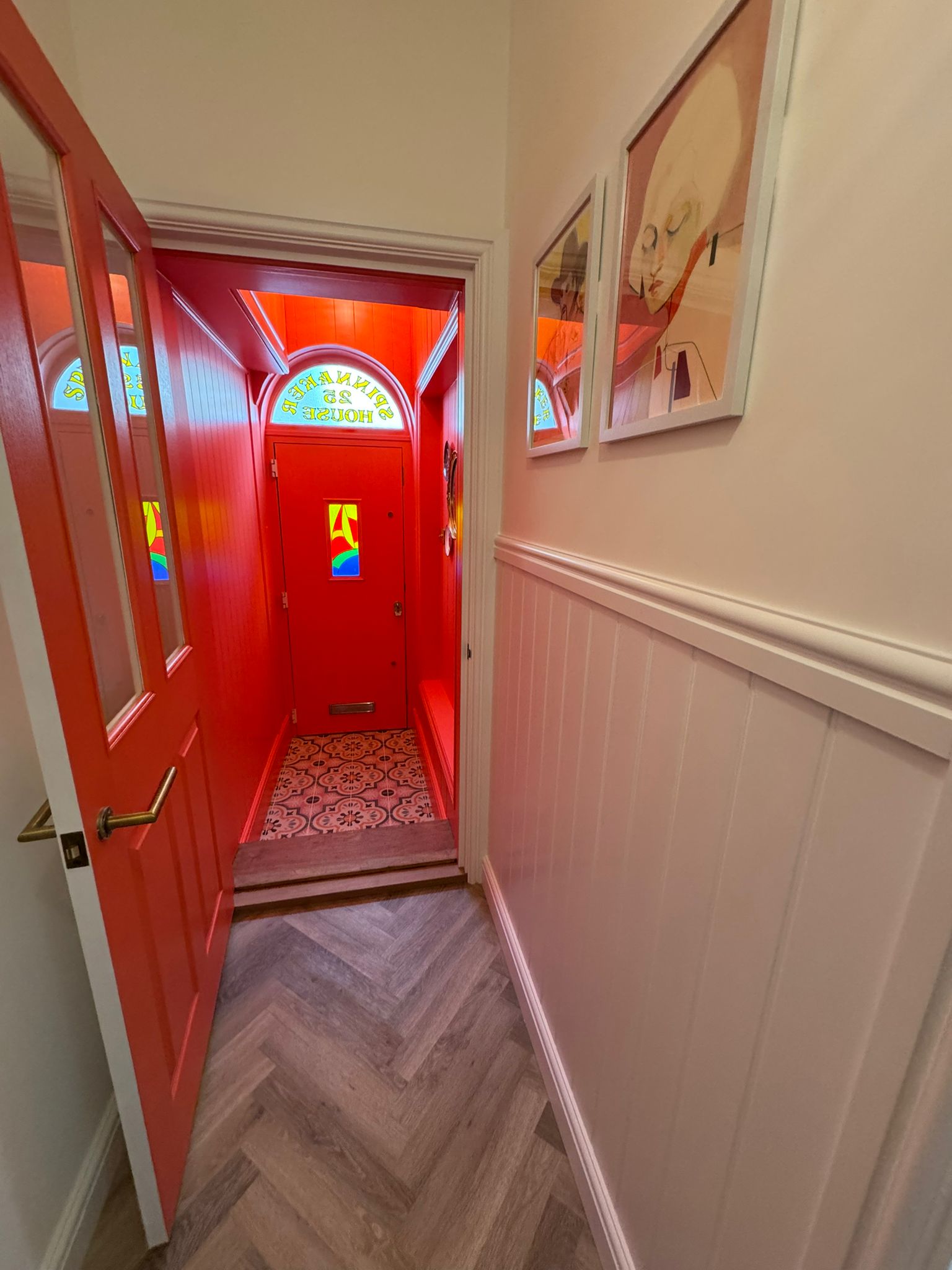 Working closely with the client’s vision, we created a striking, colour-drenched hallway using a rich, vibrant red across all panelling, ceilings, and joinery. This approach delivers a fully immersive finish, enhancing the architectural details and creating a strong visual identity throughout the entrance.