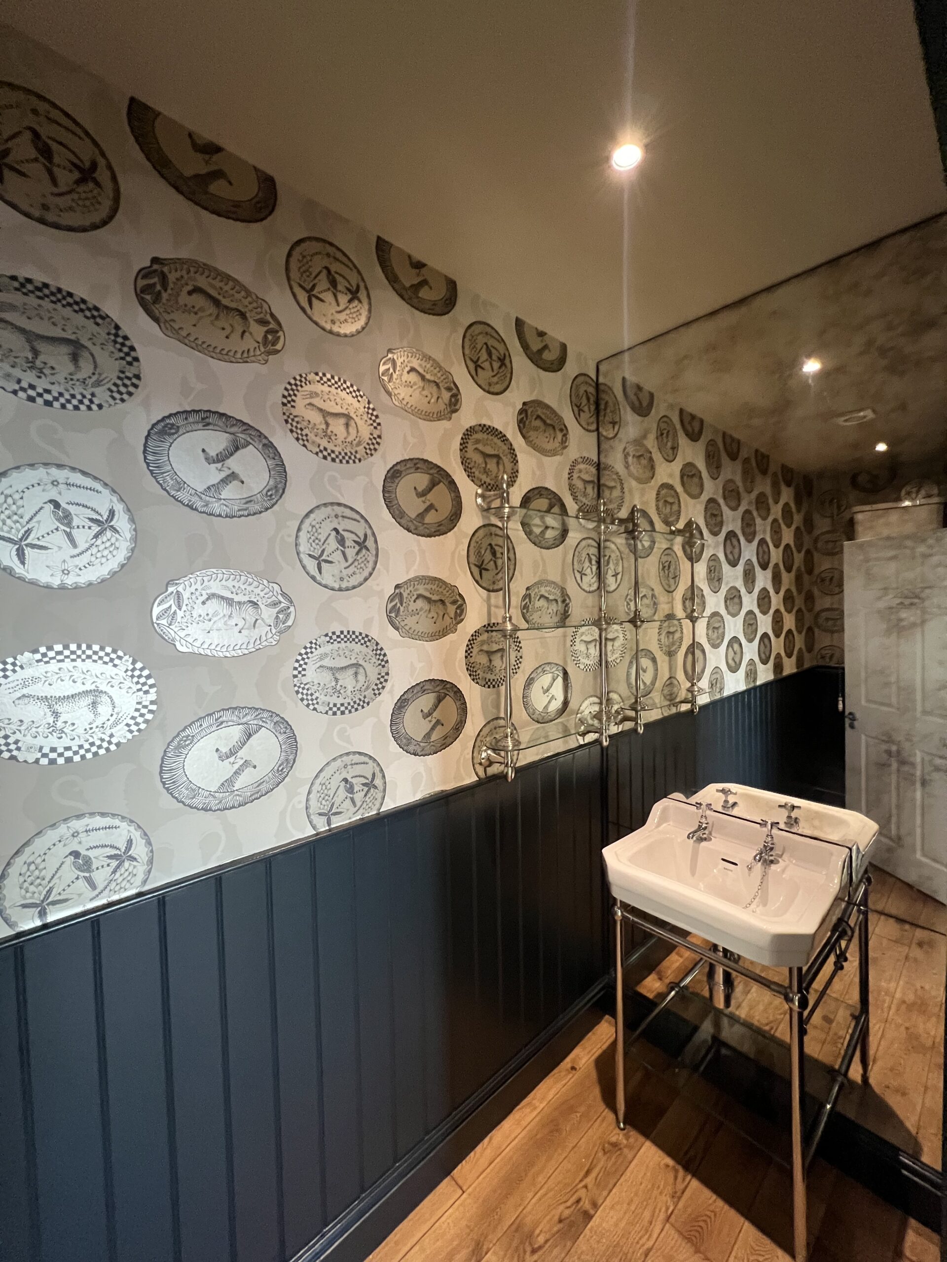 The woodwork was painted in Farrow & Ball Railings, creating a rich, cocooning backdrop, while Cole & Son wallpaper adds a layer of playful sophistication and period charm. We also supplied and fitted the smoked glass, completing the high-end, moody aesthetic.