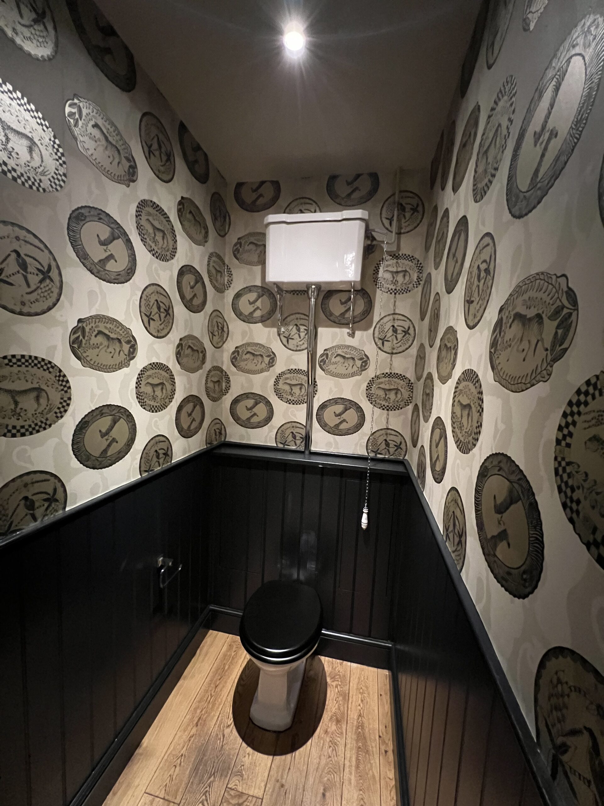 Finished with classic Victorian fixtures, a high-level cistern, and warm wood flooring, this small space proves that even compact rooms can deliver serious impact when detail and craftsmanship take centre stage.